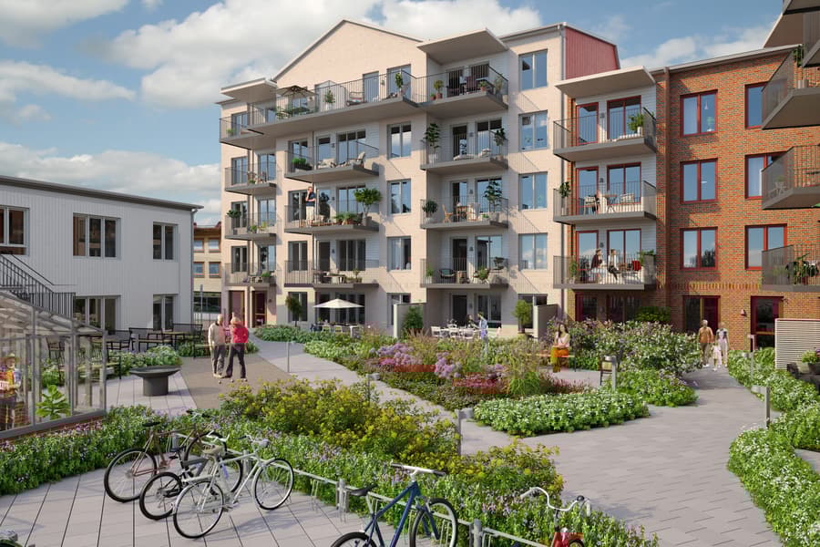 På gården blir det färgstarka planteringar, orangeri och boulebana. Inspirerande mötesplatser för avkoppling och samvaro med grannar och vänner. Gemensamt disponerar de boende också en rymlig sällskapslokal för föreningens aktiviteter och egna evenemang samt ett gästrum för övernattande gäster. Under huset byggs garage med laddstolpar och hiss till våningsplanen.