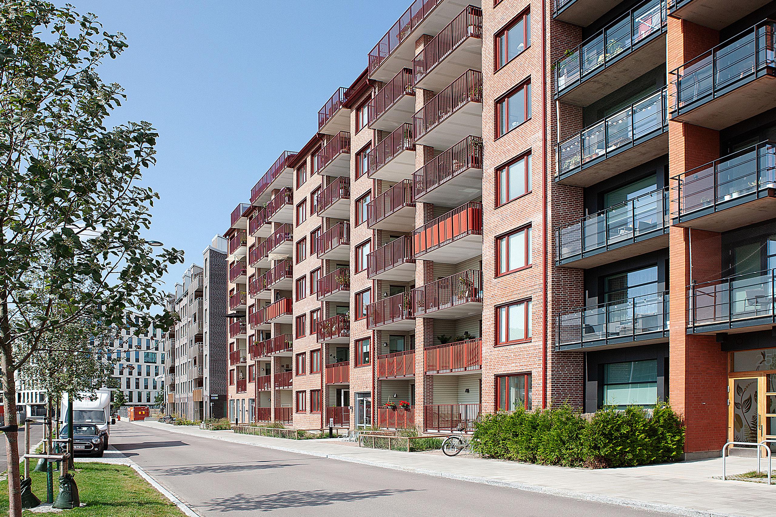 Entrésidan med lägenheternas balkonger vänder sig mot Ymers gata i sydväst och mot den stadsdelspark som planeras sträcka sig genom bostadskvarteren i södra Hyllie.