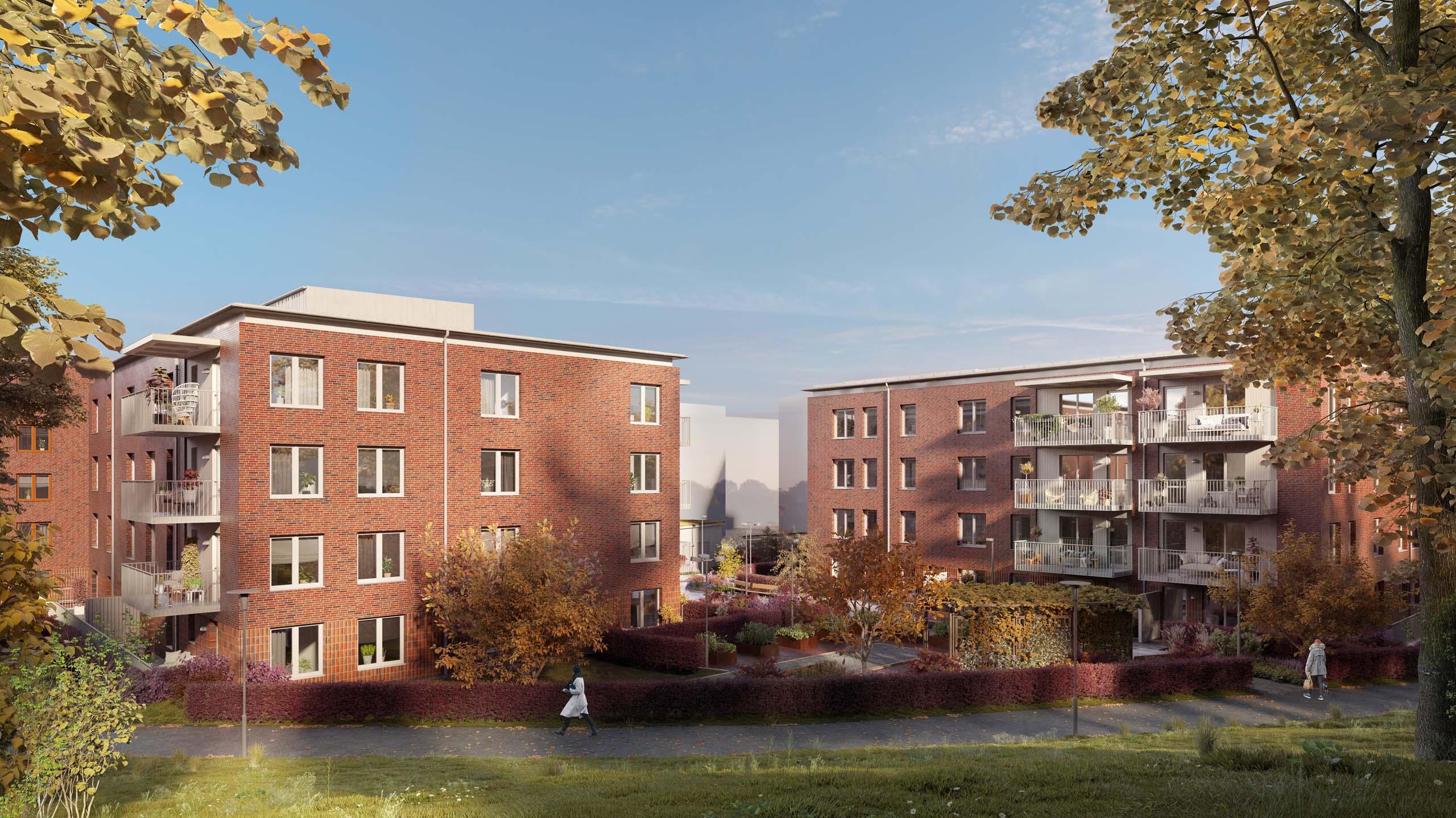 Inuti de två tegelhusen finns en blandning av lägenhetsstorlekar mellan 2 och 4 rum och kök. Vissa med öppen planlösning och alla med egen balkong eller uteplats. I gemensamhetslokalen finns det plats för både träffar med grannarna och fester med familj och vänner. Ett övernattningsrum finns för de nära och kära som har lite längre hem.