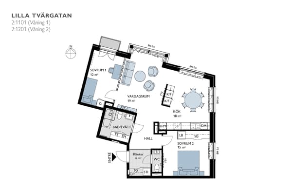 Genomgående trerummare på gaveln med sällskapsavdelning och balkong mot innergården, dubbla badrumsmiljöer och två sovrum i svalt norrläge. Kök och sällskapsrum ligger i social, öppen planlösning medan sovrummen har en avskild placering i motsatt sida. Det ena sovrummet har skjutdörrsgarderob och det andra en angränsande klädkammare. Det ena badrummet har en avdelning för tvätt och tork.