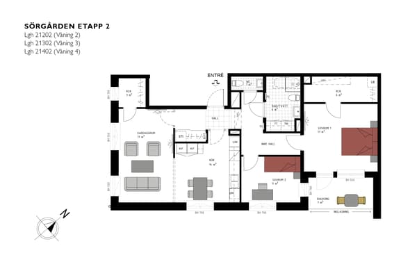 Genomgående trerummare med solig söderbalkong, kök och sällskapsrum i öppen planlösning, dubbla badrumsmiljöer, två sovrum i svalt norrläge och en klädkammare. Bra förvaring finns i både hall och sovrum. Det ena badrummet har en avdelning för tvätt och tork.