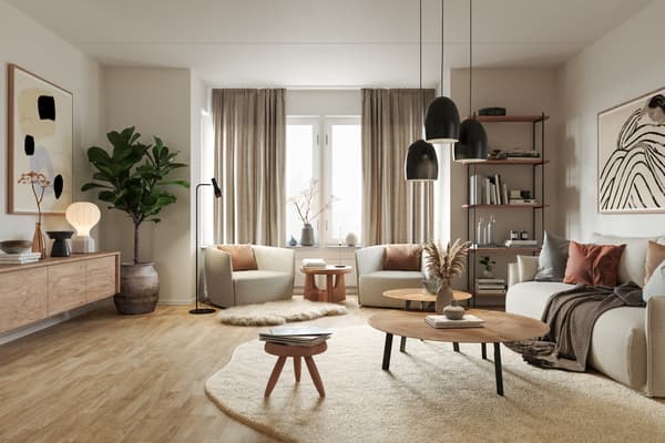 Genomgående fyrarummare med gårdsvänd balkong i västerläge, generös sällskapsavdelning med kök i öppen planlösning och avskild del med tre sovrum och dubbla badrumsmiljöer. I ena badrummet finns en avdelning för tvätt och tork. Fin förvaring finns i skjutdörrsgarderober och klädkammare.