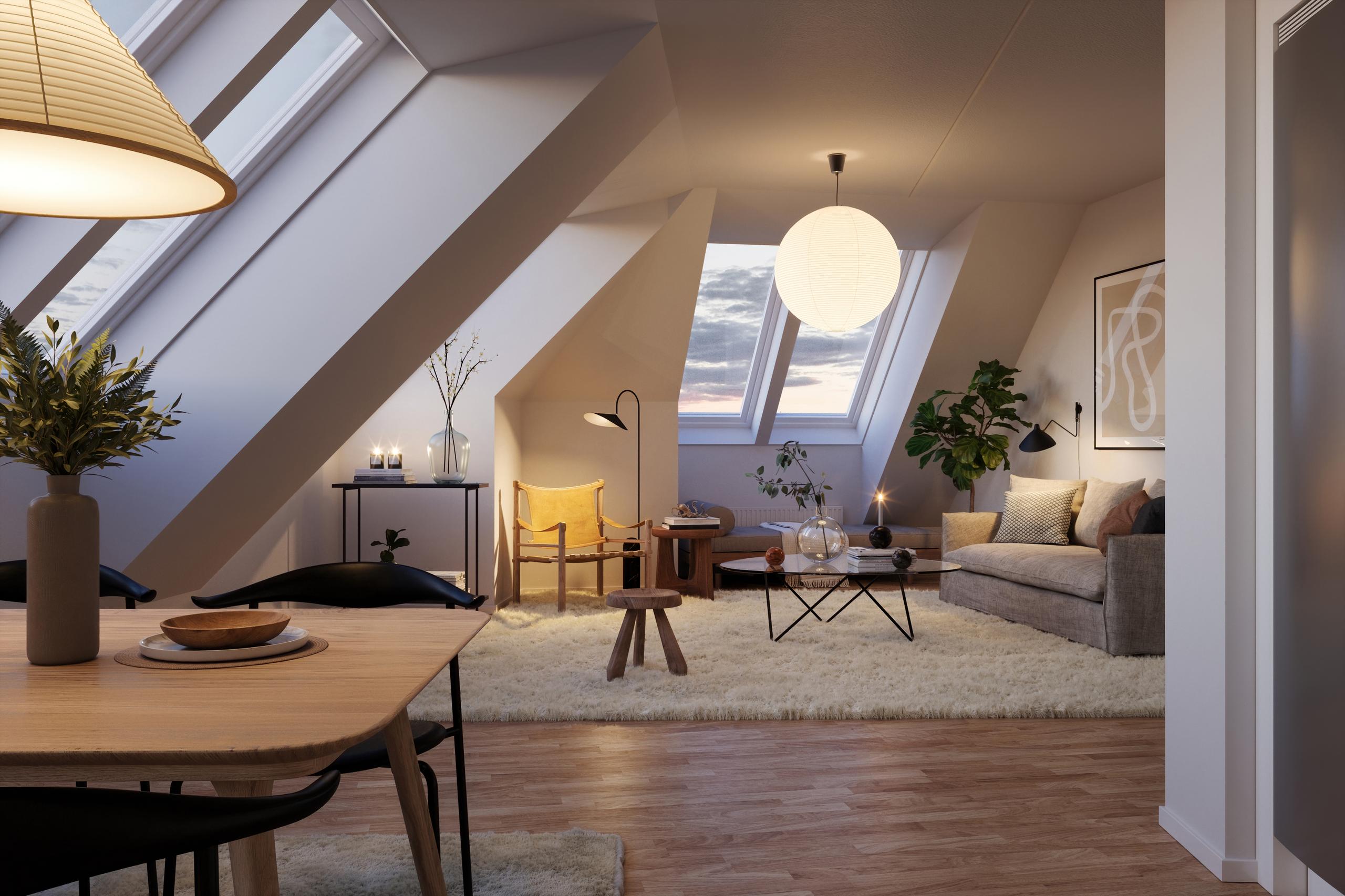 Karaktäristisk vindsvåning i vinkel med spansk balkong i kök och flera takfönster som får ljuset att flöda fritt och vackert. Bostaden har en stor avdelning med kök och sällskapsrum i en öppen och social enhet och ett sovrum med bra möblerbar yta och förvaring.