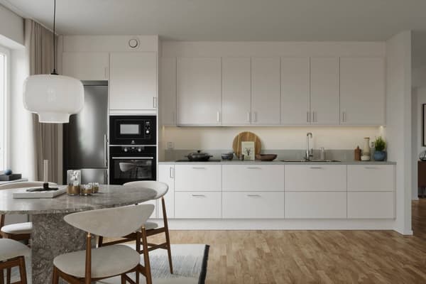 Eftersom du bor i markplan är alltid den sköna innergården i söder och de gemensamma utrymmena enkla att nå. Något som gör det lätt att umgås med grannar, pyssla med odling i växthuset eller bara njuta av en kaffe i solen på en av uteplatserna. Lika enkelt är det att nå hela stadens utbud som ligger alldeles runt husknuten. Via fönsterna i rummet möter du morgonsolen.