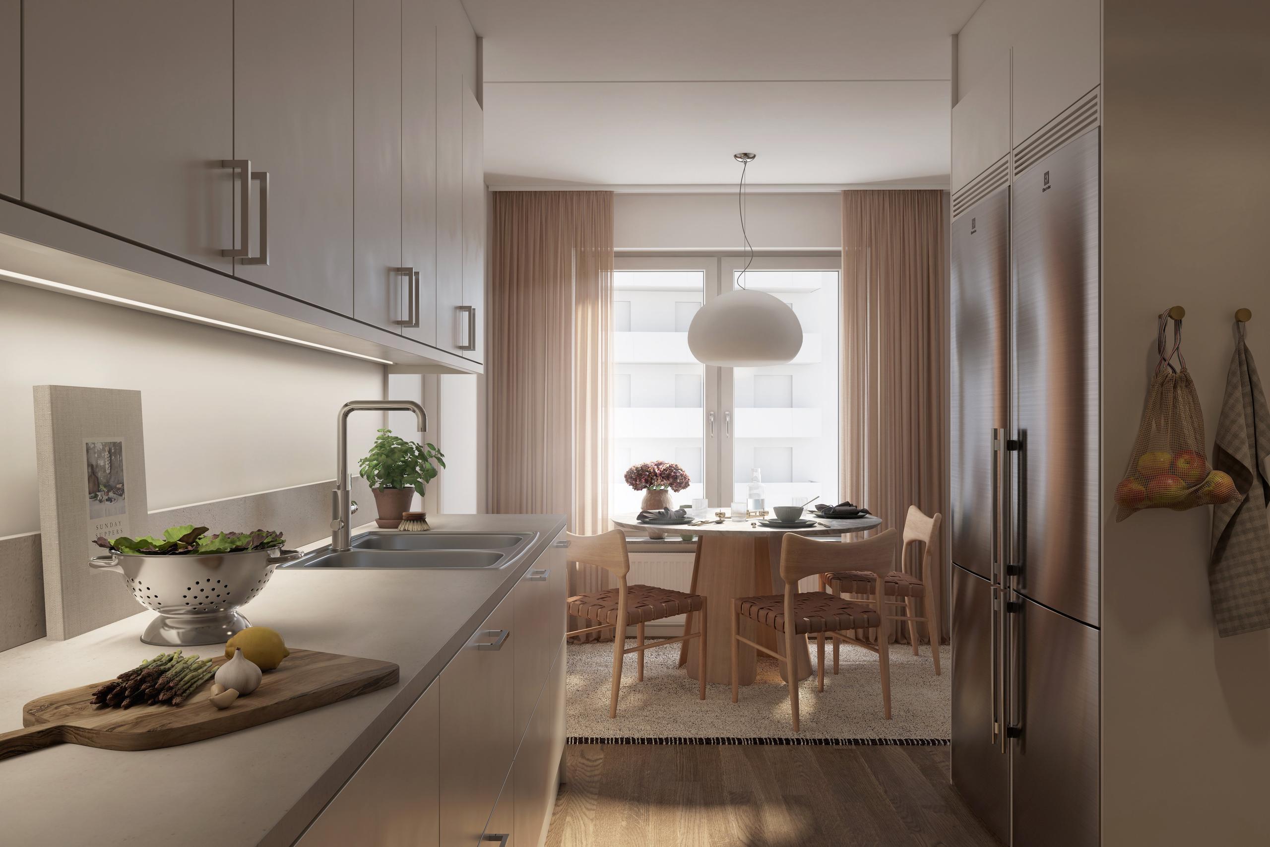Lägenheten är stilfullt inredd och har en genomtänkt helhet där alla detaljer stämmer fint ihop och skapar en röd tråd i ditt hem. Väggar i lägenheten är ljusljusbeigea eller vita och harmonierar fint med den mattlackade ekparketten på golvet och fönsterbänkarna i grå kalksten. Här får du en smakfull inredning som håller lång tid framöver.