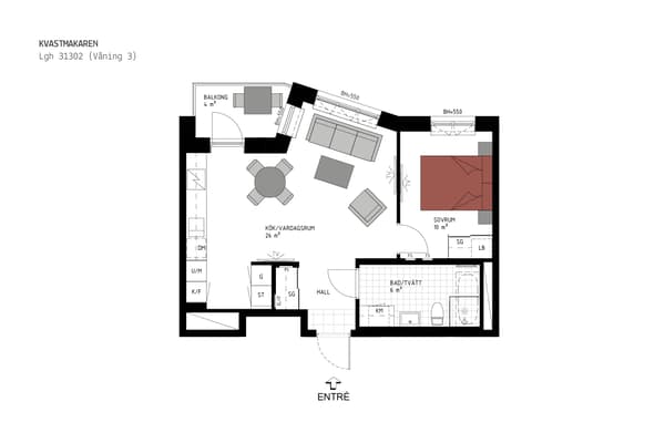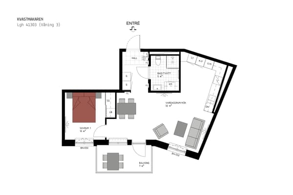 Köket har sobra släta luckor och bänkskivor i vacker kompositsten som fortsätter en bit upp på väggen som stänkskydd. Vitvarorna är noga utvalda och energisnåla. Den maskinella utrustningen består av induktionshäll, två kyl/frys samt helintegreraddiskmaskin för ett stilrent uttryck. Ugn och mikro är placerade i högskåp med praktisk arbetshöjd. I anslutning till köket ligger balkongen som vetter i ett fritt läge mot väster med en utsikt mot Sofia skola och kyrka.