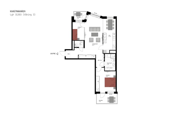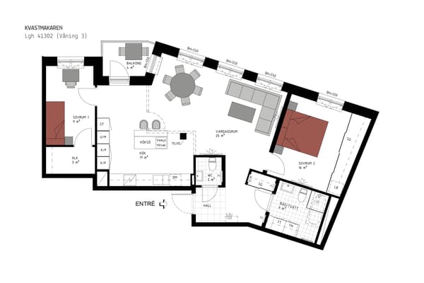 Till vänster om hallen ligger kök och vardagsrum som har ett fint öppet samband och här finns gott om plats för både matlagning och umgänge med familj och vänner. Intill vardagsrummet ligger det mindre sovrummet som även kan väljas bort för att skapa större sociala ytor. Vardagsrummet förlängs även av balkongen som vetter mot Emelies gata i ett nordvästligt läge.