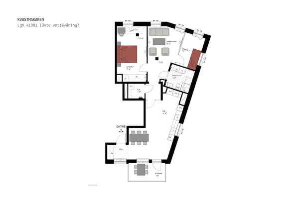 Köket har sobra släta luckor och bänkskivor i vacker kompositsten som fortsätter en bit upp på väggen som stänkskydd. Vitvarorna är noga utvalda och energisnåla. Den maskinella utrustningen består av induktionshäll, två kyl/frys samt helintegreraddiskmaskin för ett stilrent uttryck. Ugn och mikro är placerade i högskåp med praktisk arbetshöjd.