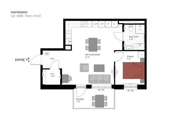 Hallen öppnar direkt upp till det rymliga vardagsrummet som har stora fönsterpartier. Vardagsrummet förlängs ytterligare av balkongen som bjuder på en avkopplande oas mot den gemensamma innergården.